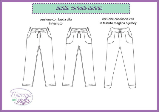 pantaloni CARTAMODELLO PDF donna vestibilità morbida da taglia s a 6xl ( circa 58 ) con video tutorial